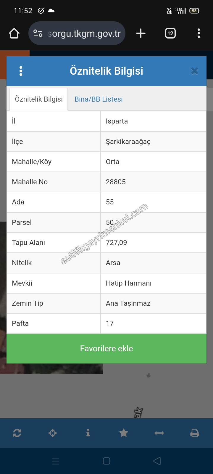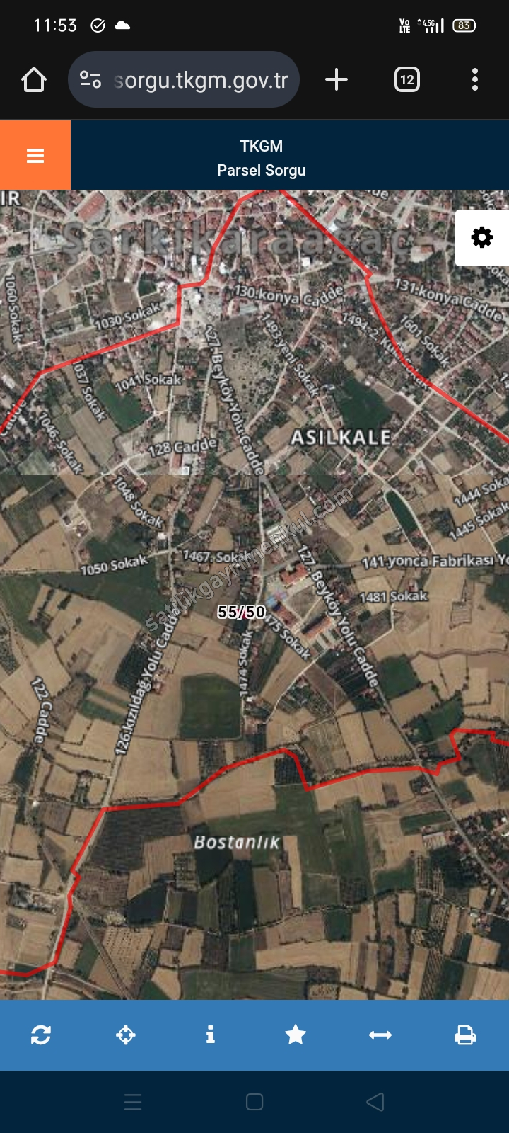 ADA PARSEL 55/50 DİR. METREKARESİ 727 DİR. İÇİNDE KİRAZ VİŞNE ARMUT CEVİZ ERİK KAYSI BULUNMAKTADIR. SONDAJ KUYUSU DALGIÇ POMPASI VARDIR. ELEKTİK VARDIR. ARSANIN ETRAFINDA KYK YURDU. İLÇE EMNİYET MÜDÜRLÜĞÜ, ANADOU VE FEN LİSESİ BULUNMAKTADIR. KANALİZASYON VE DOĞALGAZ ÖNÜNDEN GEÇMEKTEDİR. ÇİFT CEPELİDİR.